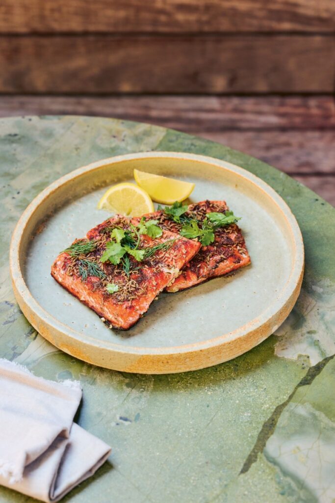 Coastal Flavours produced my favourite recipe. Spiced Pan-Seared Salmon with Herbs is now my go-to treatment for salmon. The crispy-skinned fish with a crust of spices is truly delectable. It takes about 10 minutes pull together but is sophisticated and striking enough to serve to guests. I’m happy that the publisher agreed to share the recipe here.