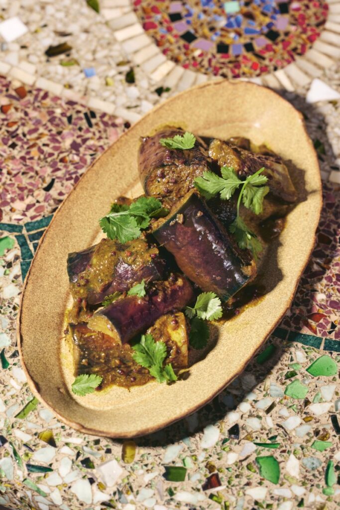 Spiced Baby Eggplant, sautéed in oil with fragrant spices, is an easy way to add pizzazz to a pretty bland vegetable. Vij suggests using the same technique with Brussels sprouts or regular eggplants. I chose the latter and the flavours were great but the eggplant’s skin was too leathery after cooking and I had to peel it off. That recipe is included here. If using regular eggplants, I would recommend peeling them before frying.